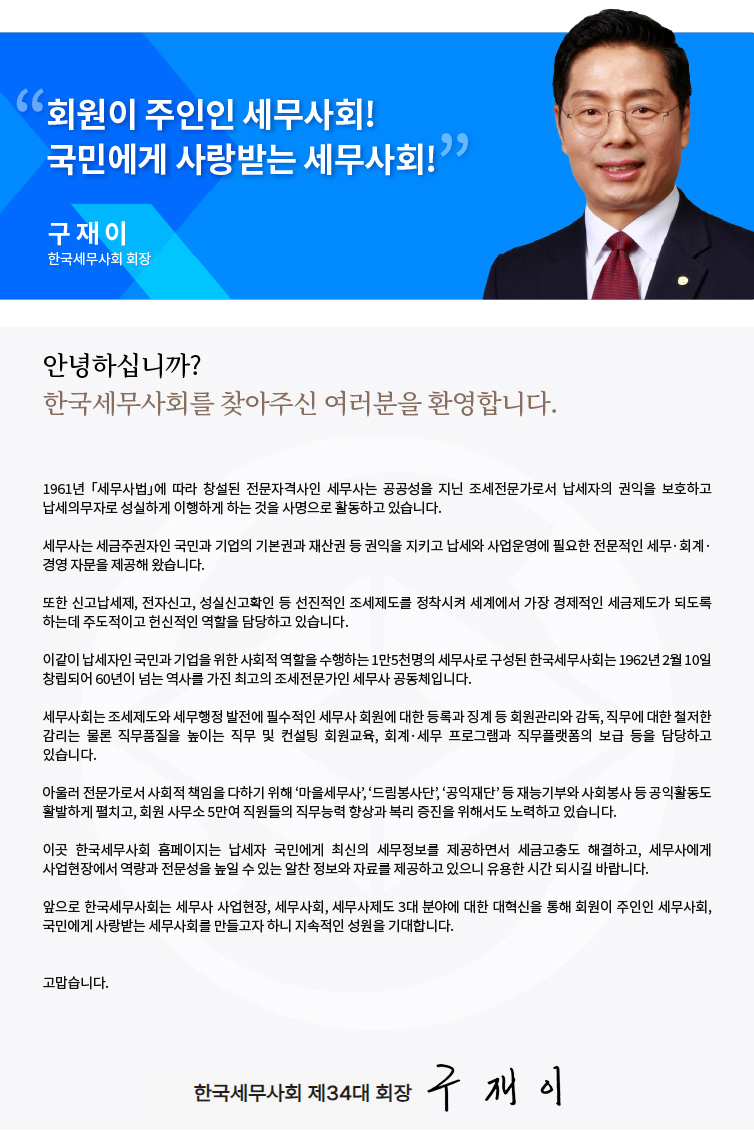 Ȩ > Çѱ¹¼¼¹«»çȸ > ȸÀåÀλ縻