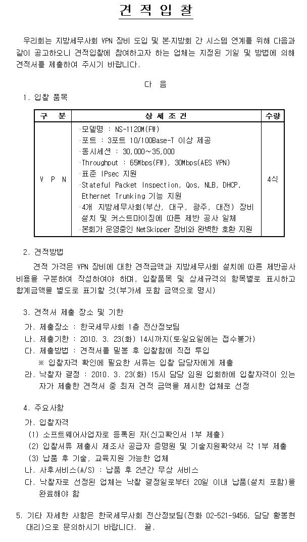 ±ÛÁ¦¸ñ [°ßÀûÀÔÂû]Çѱ¹¼¼¹«»çȸÀÇ Áö¹æ¼¼¹«»çȸ VPN Àåºñ µµÀÔ ¹× º»/Áö¹æÈ¸ ½Ã½ºÅÛ ¿¬°è °ßÀûÀÔÂû °ø°í