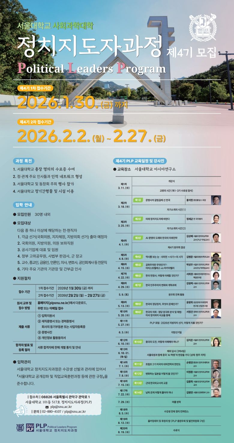 ¼¿ï´ëÇб³¿¡¼ ¡®Á¤Ä¡ÁöµµÀÚ°úÁ¤ Á¦4±â ¼ö°»ý ¸ðÁý¡¯°ú °ü·ÃÇÏ¿© ¿ì¸® ȸ¿¡ È«º¸ ¿äûÇÏ¿´±â¿¡ ¾Æ·¡¿Í °°ÀÌ ¾È³»ÇÕ´Ï´Ù. 1. Á¢¼ö±â°£ : -1Â÷: ~2026. 1. 30.(±Ý) 23:59 -2Â÷: ~2026. 2. 2.(¿ù) 23:59 -ȨÆäÀÌÁö(plpsnu.ne.kr)¿¡¼ ´Ù¿î·Îµå, ¿ìÆí ¶Ç´Â À̸ÞÀÏ Á¢¼ö 2. ¹®ÀÇó: -ÀüÈ: 02-880-4107 -À̸ÞÀÏ: plp@snu.ac.kr