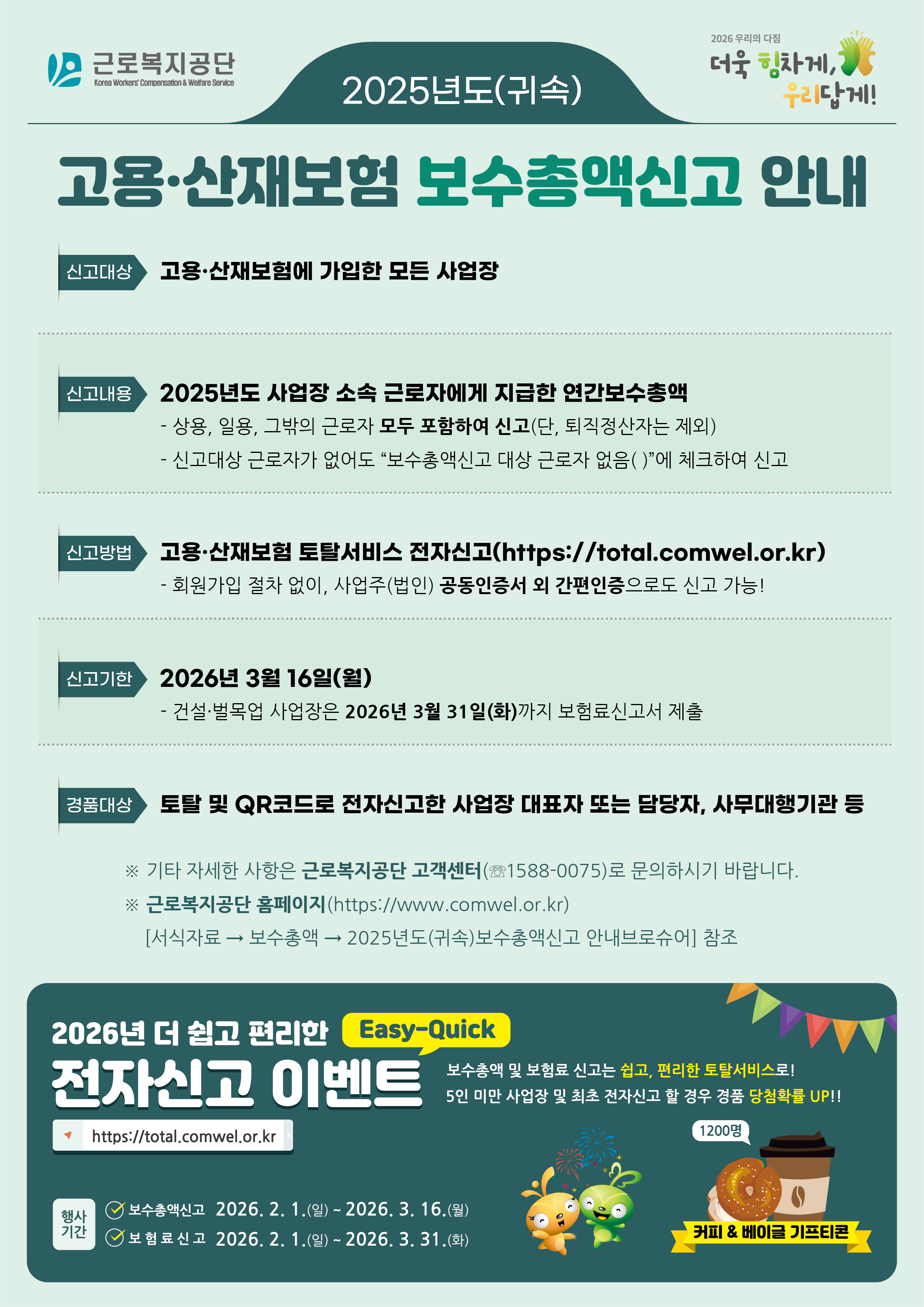 1. ȸ¿ø´ÔÀÇ °Ç°°ú »ç¾÷ÀÇ ¹øÃ¢À» ±â¿øµå¸³´Ï´Ù. 2. ±Ù·Îº¹Áö°ø´Ü¿¡¼ ÇùÁ¶ ¿äûÇÑ 2026³â °í¿ë․»êÀ纸Çè º¸¼öÃÑ¾×½Å°í¿¡ ´ëÇØ ¾Æ·¡¿Í °°ÀÌ ¾È³» µå¸®¿À´Ï ¾÷¹«¿¡ Âü°íÇϽñ⠹ٶó¸ç, »ó¼¼ÇÑ ³»¿ëÀº ºÙÀÓÀÇ ÀڷḦ È®ÀÎÇÏ¿© Áֽñ⠹ٶø´Ï´Ù. - ±Ù°Å¹ý : ¡¸°í¿ëº¸Çè ¹× »ê¾÷ÀçÇØº¸»óº¸ÇèÀÇ º¸Çè·á¡¼ö µî¿¡ °üÇÑ ¹ý·ü Á¦16Á¶ÀÇ10¡¹ - ½Å°í±â°£ : 2026³â 3¿ù 16ÀÏ(¿ù) - ÁÖ¿ä ³»¿ë 2. 2026³â ´õ ½±°í Æí¸®ÇÑ Easy-Quick ÀüÀڽŰí À̺¥Æ® ¾È³»¹® 1ºÎ. ³¡. |